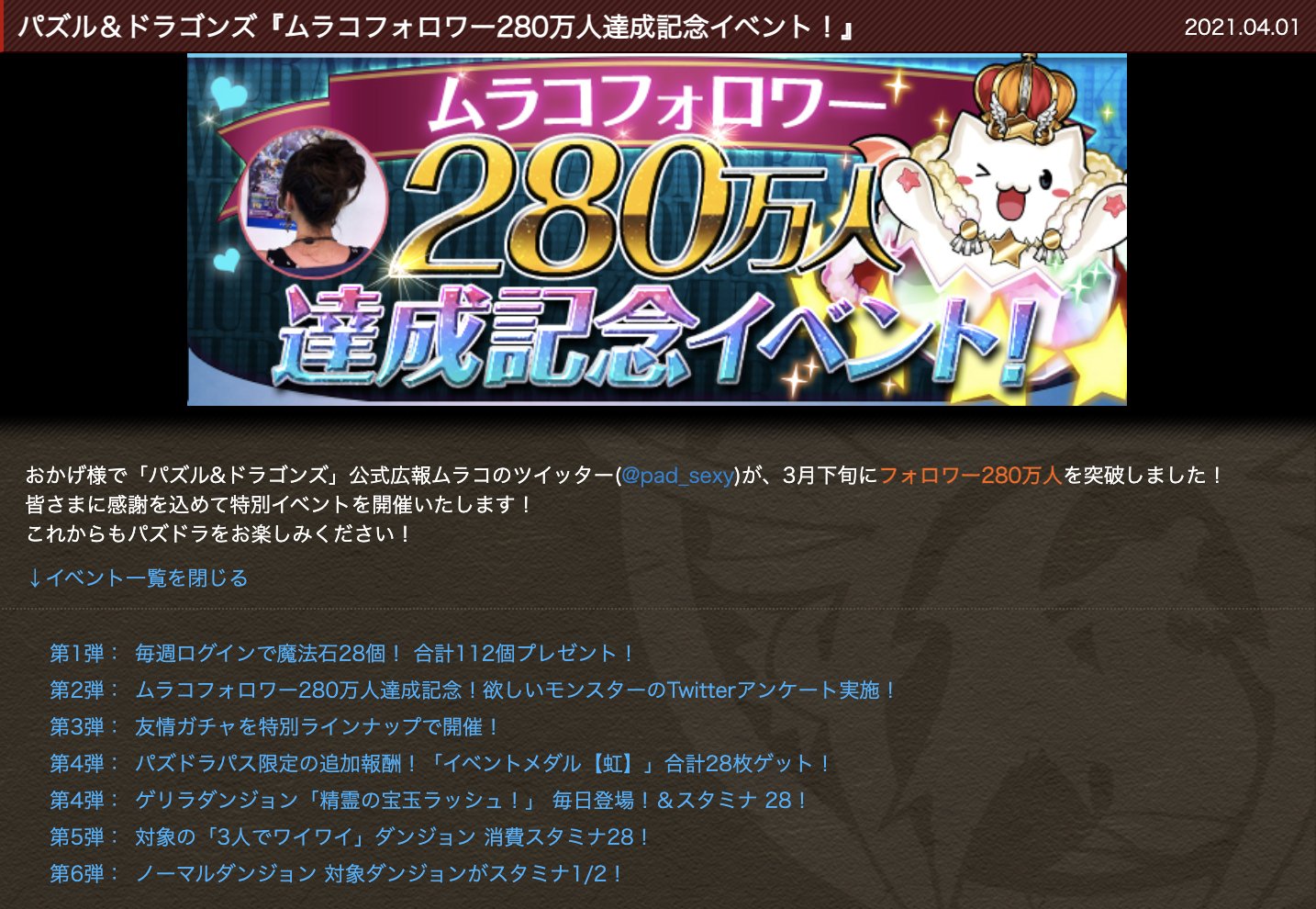 パズドラ ツイッターパズドラ pad_sexyパズドラ パズル&ドラゴンズ公式パズドラ onパズドラ X:パズドラ 🎉モンスター交換所アップデート記念🎉パズドラ \Twitter「いいね!」キャンペーン!/パズドラ パズドラ このツイートが「1万いいね」されるごとにパズドラ 「イベントメダル【虹】」1枚をパズドラ 全ユーザーの皆様にプレゼント✨パズドラ ぜひみんなで「いいね」を押してねパズドラ ...パズドラ ありす🔰ボーダー予想パズドラ onパズドラ X:パズドラ #パズドラパズドラ 「凶兆」チャレンジ